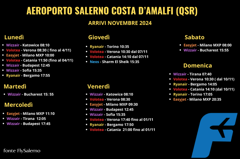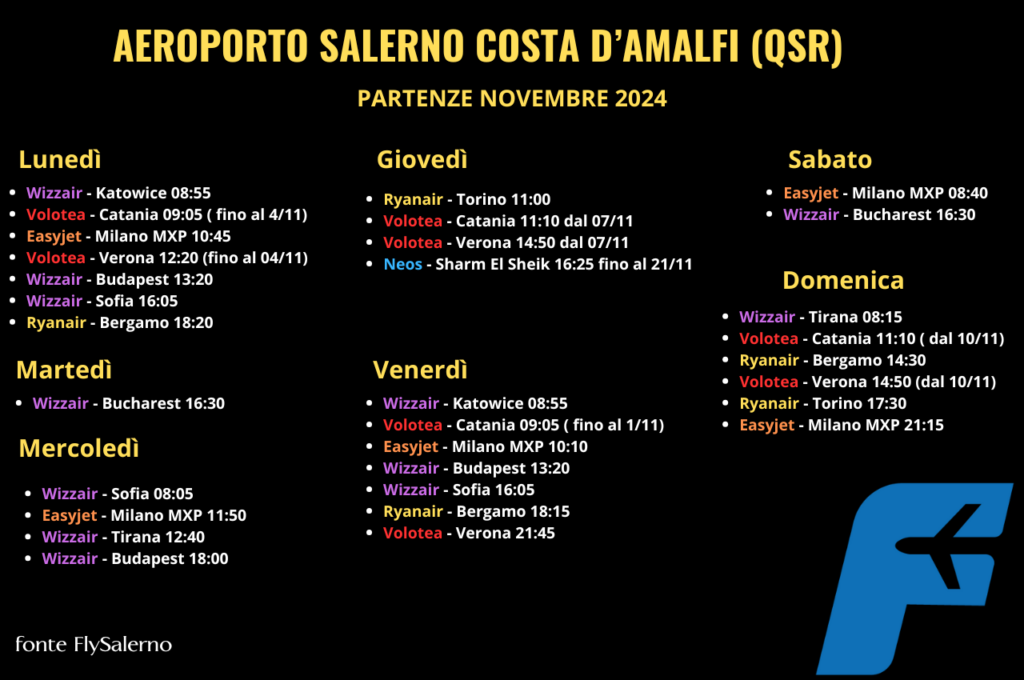 Con l’arrivo di novembre, l’Aeroporto Salerno Costa d’Amalfi (QSR) si prepara ad accogliere i viaggiatori per la stagione invernale 2024. Questa struttura compatta ma ben collegata si conferma un punto di partenza ideale per coloro che desiderano esplorare mete italiane ed europee. Di seguito, tutti i dettagli sui voli in partenza e in arrivo durante il mese di novembre.