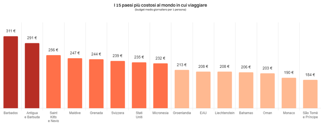 Al primo posto troviamo Barbados, dove un soggiorno vi costerà mediamente 311 € al giorno. Seguono Antigua e Barbuda con un budget di 291 € e Saint Kitts e Nevis, dove spenderete circa 256 € al giorno. Anche le famose Maldive(247 €) e l’isola di Grenada (244 €) rientrano tra le prime cinque, grazie alla loro reputazione di paradisi esclusivi per chi cerca il relax e l’eleganza.