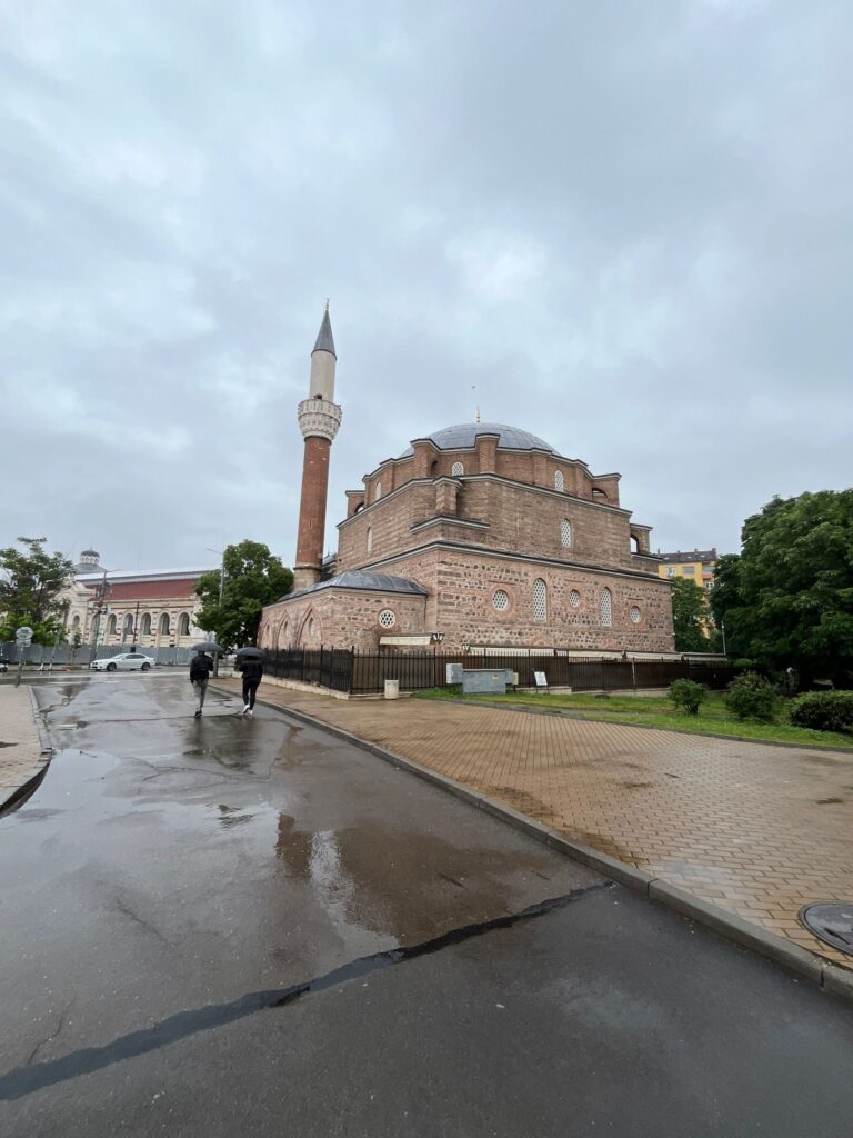 La domenica è il nostro ultimo giorno, avevamo l’aereo alle 21.25 e quindi dopo una solita colazione abbondante passiamo tutta la giornata in giro. Ha piovuto leggermente tutta la mattinata, e il cielo grigio, la pioggia e il fatto che era domenica mattina c’era pochissima gente in giro e l’atmosfera era diventata un po’ ‘triste’ tra i tram vecchi che passavano e qualche passante col cane a spasso. Anche qui notai come se Sofia ci stesse regalando la sua immagine che ha sofferto, tra i palazzi grigi e i monumenti bellissimi nei giardini. Tutto questo però faceva parte del quadro generale della città che comunque mi è piaciuta tantissimo e che la consiglio sicuramente per un viaggio low cost, in un weekend magari visto che si visita a piedi tranquillamente. Dopo aver visto le ultime cose da vedere,tra cui il teatro nazionale ci dirigiamo al famoso mercato delle donne. Un mercato all’aperto dove sapevo c’era l’essenza di Sofia e della sua gente. Per arrivarci passiamo per chi definisce quell’area il ‘ triangolo della tolleranza’. In pochi metri c’è una chiesa ortodossa, una moschea e la sinagoga. La moschea Banya Bashi è piccolissima ma fa la sua figura, l’ingesso mi ha ricordato quelle ad Istanbul, il telo verde all’ingresso e le scarpiere ai lati prima di entrare. Piccola ma curata all’interno in ogni dettaglio è stata una piacevole sorpresa, dopo quelle ad Istanbul me ne sono innamorato.