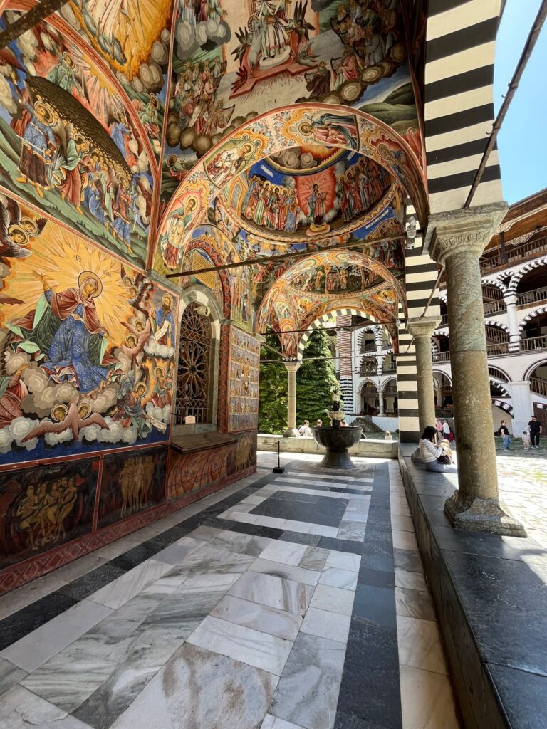 Ero troppo curioso, fare 120 km in pullman e vedere com’era la Bulgaria ed osservare quante più cose potevo. Durante il tragitto passiamo attraverso dei paesini rurali tra cui Kocherinovo, molto particolare, un po’ antico ma affascinante dove c’era tutta l’essenza del luogo, tra trattori vecchissimi e soprattutto cicogne sui tetti con i loro nidi enormi, fu davvero una sorpresa piacevole. Dopo quasi 2 ore arriviamo finalmente a Rila, dopo aver ammirato per strada i numerosi torrenti e corsi d’acqua immersi in questa natura bellissima. Arrivati nel Monastero restiamo tutti a bocca aperta. Una meraviglia di architettura immerso in questo sfondo di verde e di montagne ancora un po’ innevate nonostante fosse maggio. Subito mi fiondo sotto i portici del monastero che avevo visto nelle foto. Uno spettacolo fantastico, degli affreschi mantenuti benissimo e con colori forti e vivaci. Erano dappertutto, sulle pareti, sotto agli archi, uno più bello dell’altro e ognuno che rappresentava un momento o un evento in particolare. Vederlo dal vivo è stato davvero stupendo, ero perso tra questi meravigliosi dipinti colorati. Entriamo anche all’interno dove non si potevano fare foto anche qui, ed altri affreschi colorati coloravano le pareti mentre donne ortodosse pregavano con il velo in testa e con la punta all’indietro. Un arcivescovo ortodosso con la sua barba bianca mi diede un volantino con un regolamento interno, forse ebbe il sospetto che potessi fare qualche foto.