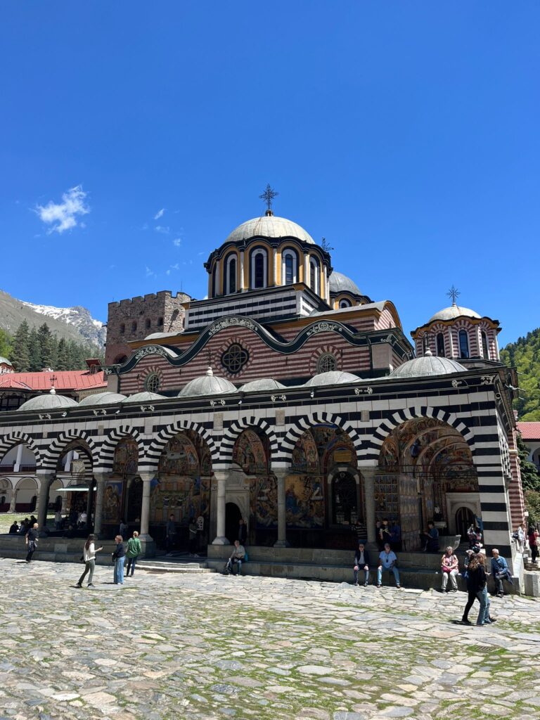 Il volo parte alle 22:15 ed è arrivato a Sofia all’ 1 di notte, infatti ho prenotato un taxi per l’hotel su Booking e un autista gentile mi aspettava agli arrivi con un cartello con il mio nome. Per la strada dell’hotel intravediamo la cattedrale di Aleksander Nevski, davvero particolare e tutta illuminata. Dopo un non rapido check-in finalmente abbiamo la nostra stanza all’hotel Central Plaza, comoda spaziosa e pulita. La colazione è davvero fornita e abbondante, uova, pancetta, wurstel, prosciutto e formaggio, ma anche cereali, yogurt e pancake. Dopo una bella abbuffata lasciamo l’hotel e ci dirigiamo alla cattedrale Aleksander Nevski dove sarebbe partito il nostro pullman per l’escursione alla chiesa di Boyana e al Monastero di Rila. Con un caldo sole ammiriamo da vicino la cattedrale, simbolo e icona di Sofia. Davvero particolare con quelle cupole verdi e le croci ortodosse sopra, la cosa che mi ha sorpresa è che era in una piazza davvero tranquilla e non affollata pur essendo abbastanza estesa. Una volta partiti la nostra guida Kamen che parlava italiano e inglese, ci spiega un po’ il programma dell’escursione. Prima tappa la chiesa di Boyana a 10 min da Sofia. E’ una chiesa antichissima immersa in un vero e proprio boschetto con tantissimo verde rigoglioso. Si entra al massimo 12 persone alla volta, infatti è davvero piccolissima e gli affreschi all’interno ti fanno capire perché è un patrimonio del 1100. Piccola e immersa nel verde, ricca di affreschi all’interno dove purtroppo non si potevano fare foto, è stata una delle prime cose che mi ha colpito, soprattutto la pace intorno alla chiesa, dove abbiamo passeggiato tra piccole lapidi e alberi semi-giganti. Dopo Boyana ci aspettano quasi 120 km per raggiungere il Monastero nelle montagne di Rila.