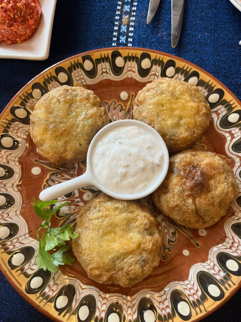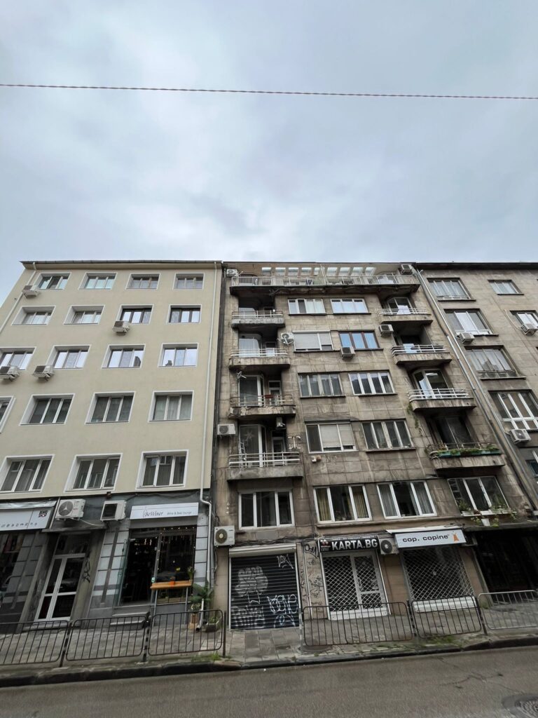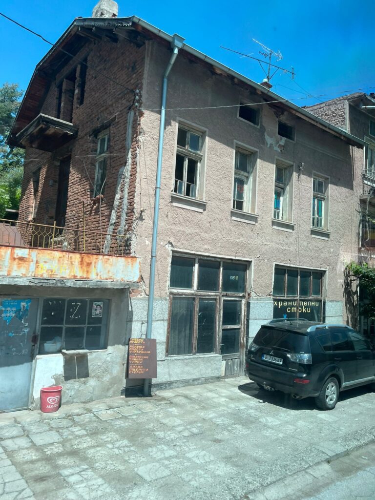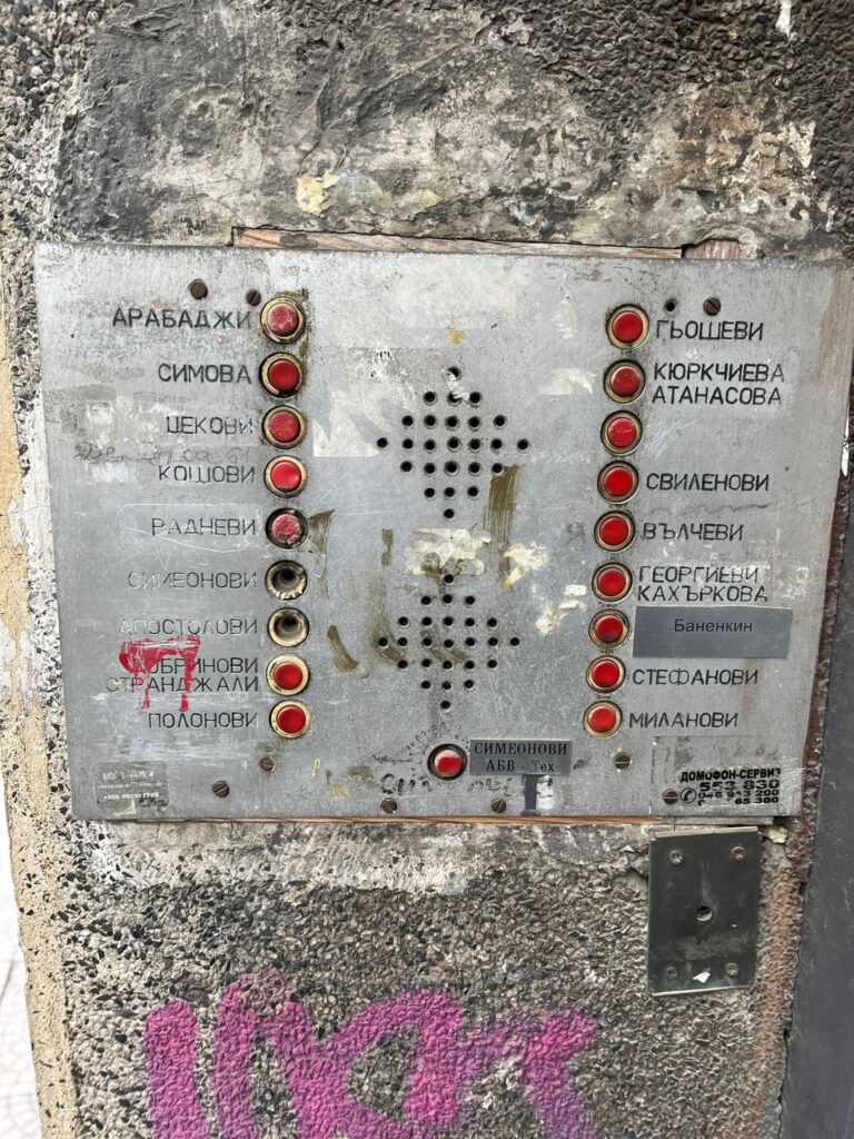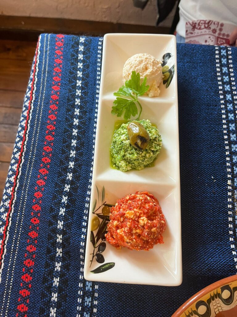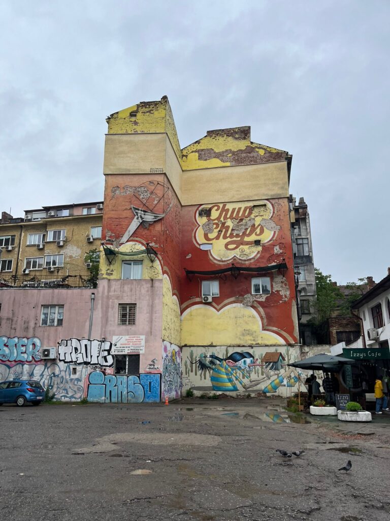 Proseguiamo più avanti verso la sinagoga, ma visto il momento storico e i nostri zaini la guardia giurata all’ingresso ci ha negato l’accesso proprio perché i nostri zaini erano troppo grandi. Un peccato perché ero molto curioso di visitare una sinagoga e peccato perché non hanno proprio controllato i nostri zaini, era un no e basta. Tra vicoli e vicoletti, murales, citofoni in cirillico di palazzi datati e giardini fioriti raggiungiamo il nostro ristorante per il pranzo: Manastirska Magernista restaurant. Una cameriera gentile in inglese ci accoglie e ci fa accomodare al tavolo, anche qui l’atmosfera era particolarmente tipica nell’arredamento e nell’allestimento del locale. Ordiniamo delle polpette di spinaci, un tris di spezie e una shopska salata (un’insalata di verdure e formaggio) come antipasto. Successivamente un kebab di maiale servito come uno spiedino gigante. Anche qui mangiammo bene e spendemmo poco (circa 25 € a testa) e prima di andarmene ero incuriosito dal tavolo affianco, una giara di vetro con dello yogurt, chiesi di assaggiarlo e mi spiegarono che è uno yogurt da bere anche a pranzo molto usato in bulgaria.