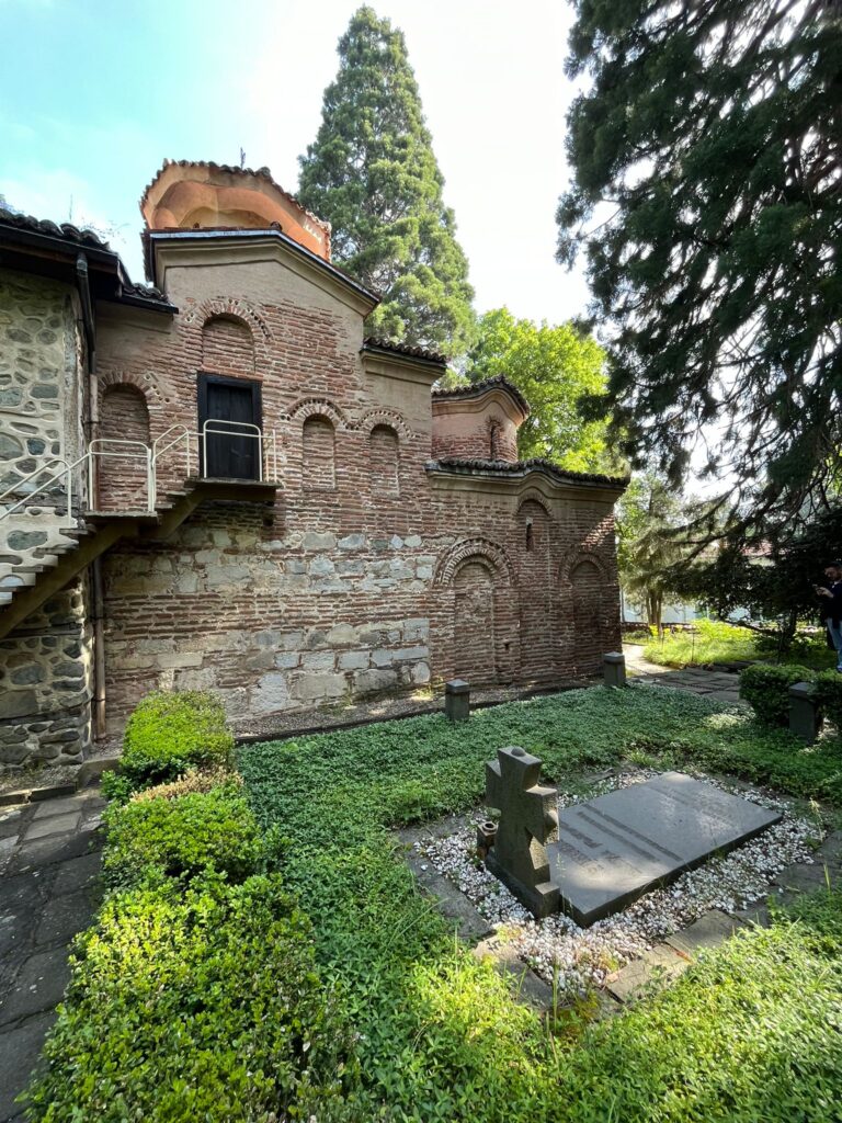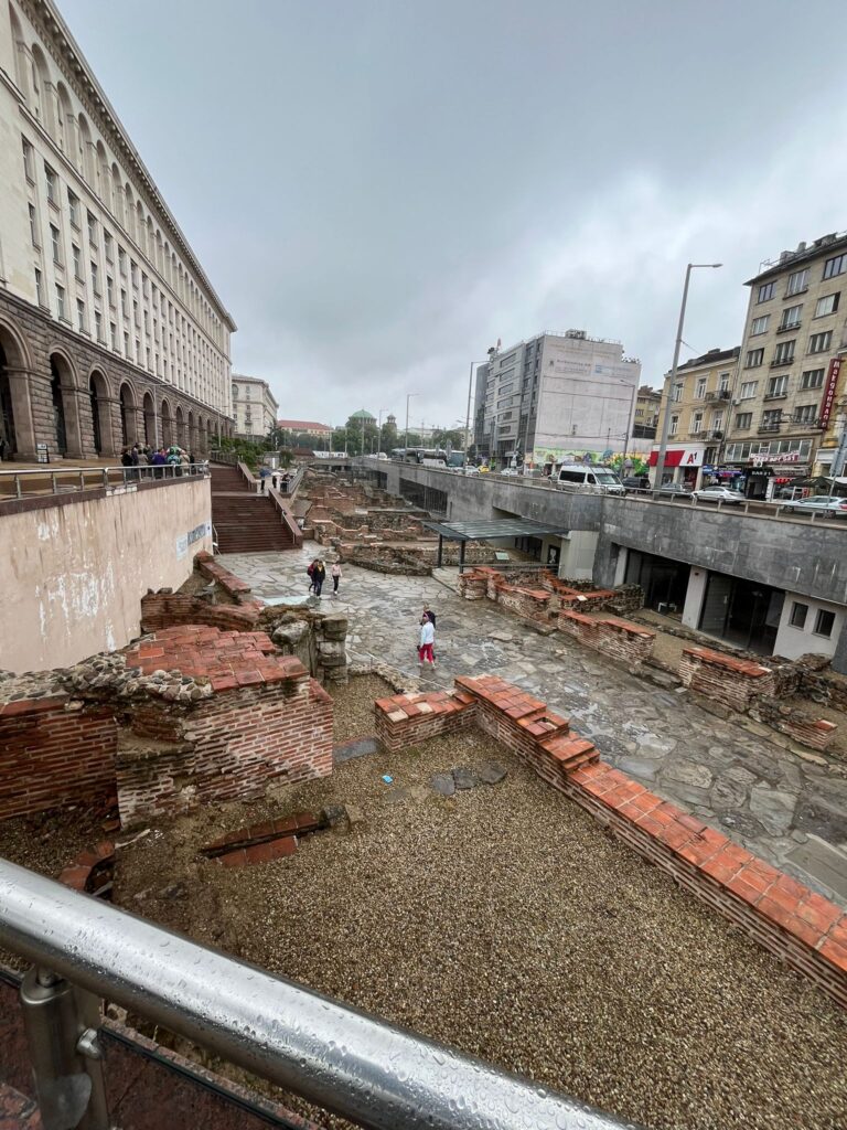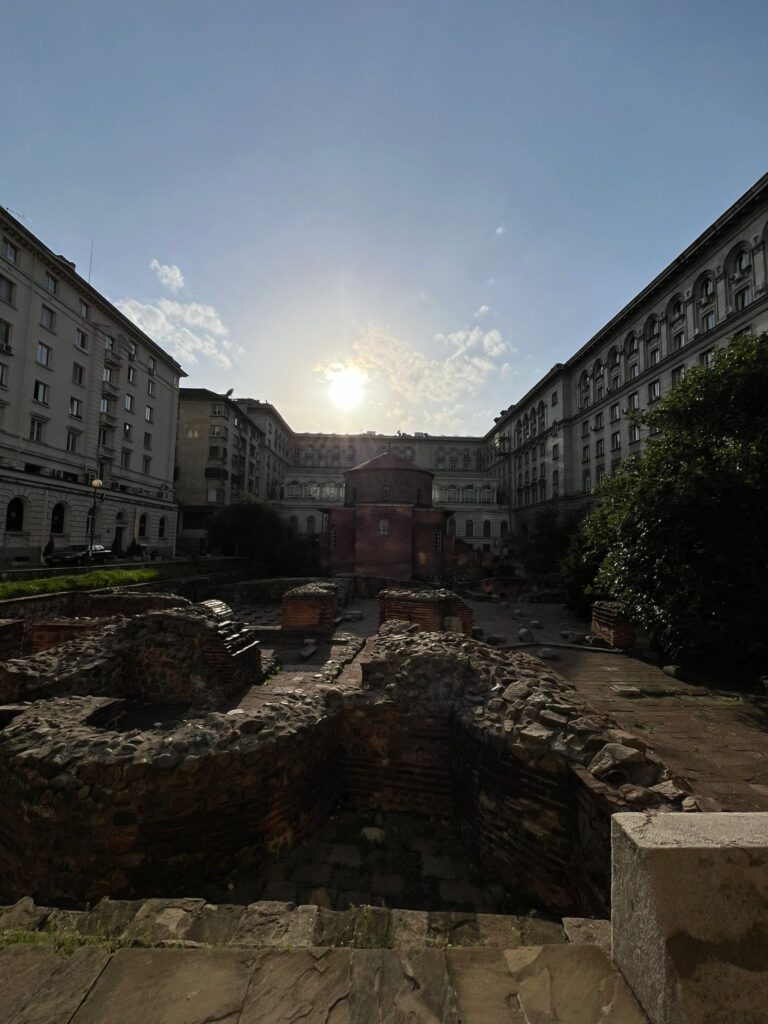 Pochi metri dopo la chiesa c’è il museo archeologico dove sapendo che quel giorno erano gratis chiediamo informazioni, infatti erano gratuiti dalle 18 a mezzanotte. Dovevamo aspettare le 18 e quindi entrammo in un caffè difronte che aveva nell’ingresso una macchina anni 80’ dipinta di giallo con all’interno dei peluche, era un arredamento molto particolare ma bello. Dopo un succo credo di melograno andiamo al museo dove su due piani c’erano quasi tutti gli animali imbalsamati in delle teche che non erano di certo moderne ma che caratterizzano il museo. Girando per la città infatti sia osservando alcune persone o qualche tram, furgone, ma soprattutto dei palazzi in dei vicoli del centro si aveva la sensazione che si era negli anni 80’. Non è una critica ma era davvero come se spesso eri tornato indietro nel tempo. Anche questa è la bellezza di Sofia che in alcuni tratti ha ancora i segni del comunismo, ed è tutto comunque così unico e particolare. Facendo ritorno dal museo all’hotel, visitiamo la Rotonda di San Giorgio, una chiesa e delle rovine antichissime circondate da palazzi moderni. Fu strano vedere questa costruzione antichissima e bellissima all’interno circondata dalla modernità, anche lì ebbi la sensazione che il tempo si era fermato.