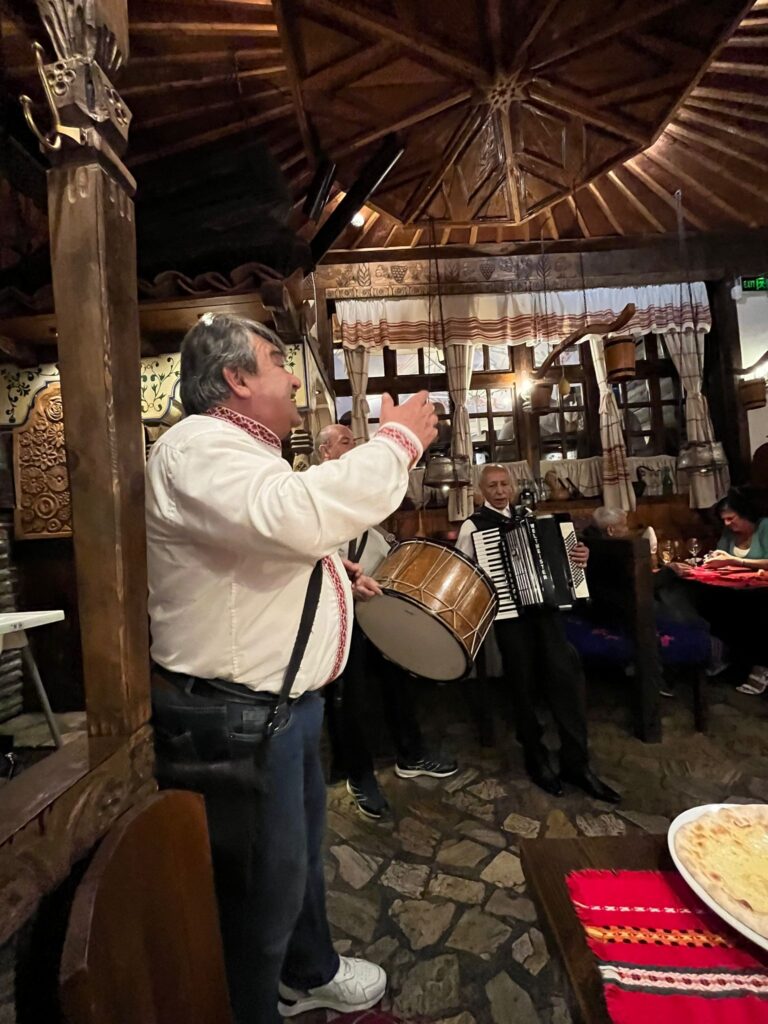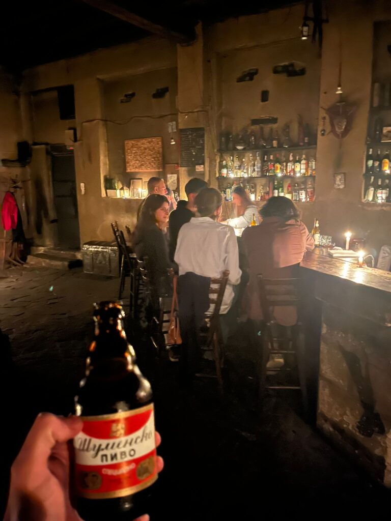 A cena andammo in un ristorantino tipico del centro, suggeritomi oltre da Tripadvisor anche da un caro amico: Hadjidragonov’s Cellars. Era davvero particolare con la maggior parte dell’arredamento in legno, abiti tipici appesi ai muri insieme a degli utensili per l’agricoltura e l’artigianato. Ordiniamo una pide di formaggio per antipasto e una tipica insalata con scaglie di formaggio di pecora e come piatto principale un misto di carne alla griglia. Pollo, kebab di agnello, carne di maiale, insieme a patate al forno e una sorta di insalata russa. Fu davvero tutto squisito e reso ancora tutto più particolare da un terzetto di musicisti bulgari che cantavano e suonavano canzoni tipiche bulgare tra i tavoli. Questa per me è l’essenza del viaggio: mangiare la cucina tipica in un ristorante tipico e con la musica e le canzoni ero proprio immerso nella cultura bulgara. La serata però finì con una sosta unica e bizzarra. Sapevo che c’erano questi bar nascosti a Sofia, ma uno in particolare: Hamabara bar. Vidi in un reel su instagram la posizione, un vicolo buio con in fondo una porta di legno graffiata e vissuta. Bussiamo ed entriamo. Era tutto buio, solo candele sul balcone e sui tavoli e lungo la scala per andare al piano superiore. E’ uno dei bar nascosti più particolari di Sofia, con solo candele, anche nel bagno, ordiniamo una birra e stiamo quasi un’oretta increduli in quell’atmosfera particolare con solo quelle candele a illuminare il bar, che alla fine era una stanza unica con il bancone e difronte dei tavoli con sgabelli e un piano superiore dove c’erano altri tavoli.